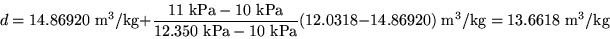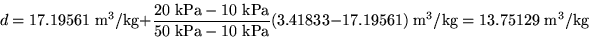 The desired quantity d is now the specific volume at 100C and 20 kPa. We set the value d1 to the specific volume at g1=10 kPa (and 100C,) so d1=17.19561 m3/kg according to the table, and d2 to the specific volume at g2=50 kPa (and 100C,) so d2=3.41833 m3/kg.
