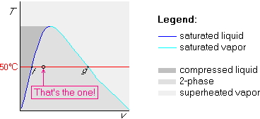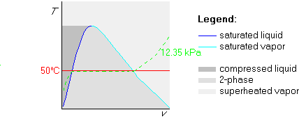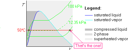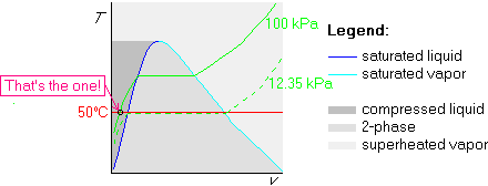 Now the trick is to find out what isobar coincides with this isotherm in the two-phase region. So, we look up 50C in table B.1.1, and find that its saturated pressure is 12.35 kPa. We can now draw this isobar as a dotted line: