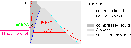 If we want, or need, to be more precise, we can interpolate in table B.1.1 to exactly 100 kPa. That gives 99.61C. For water, however, there is a quicker method. The book gives another tabulation of the saturated data, ``pressure entry'' table B.1.2, for round values of the pressure. If we look in B.1.2, we immediately see that the saturated temperature at 100 kPa is 99.62C exactly. Pretty much the same as we found using interpolation. Note however, that for substances other than water, no separate ``pressure entry'' table is available.