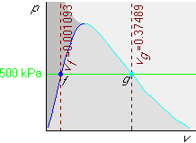 Now look up the saturated conditions at 500 kPa. Table B.1.2 shows that the specific volume of saturated liquid water at 500 kPa is vf = 0.001093 m3/kg and that of saturated water vapor at 500 kPa is vg = 0.37489 m3/kg. Show the isochores that have those specific volumes as vertical brown dotted lines in the pv-diagram. Make sure that they intersect the 500 kPa isobar at the blue saturated liquid, respectively saturated vapor points on this line: