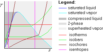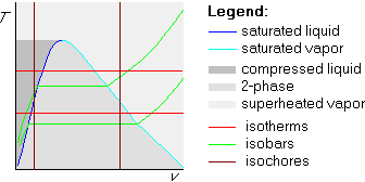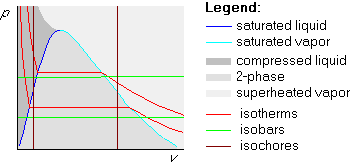 The vertical axis represents the temperature T, while the horizontal axis represents the specific volume v. Each point in the graph represents one particular state of the substance, with the point's height giving the temperature and the point's horizontal position the specific volume.