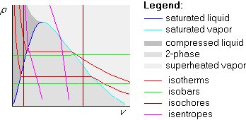 Finally draw the isochore with the given specific volume v = 0.001 m3/kg in the pv-diagram. Since 0.001 m3/kg is less than the saturated fluid value vf = 0.001093 m3/kg, this isochore will be before (i.e. to the left of) the vf one: