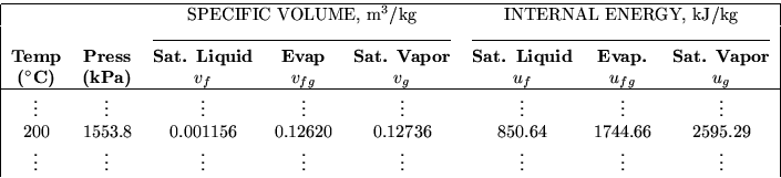 The value in the third column tells me that the specific volume of the saturated water at 200C is 0.001156 m3/kg if it is all in liquid form (the ``f'' in vf stands for liquid; think ``fluid''). Similarly the value in the fifth column tells me that the specific volume of saturated water is 0.12736 m3/kg if it is all in vapor form (the ``g'' in vg stands for vapor; think ``gas''). (The value in in the fourth column I skipped is merely the difference between the two.)