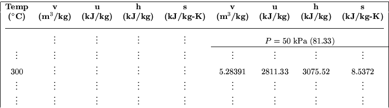 You see that at 300C and 50 kPa, the specific volume v=5.28391 m3/kg, the internal energy u=2811.33 kJ/kg, the ``enthalpy'' h=3075.52 kJ/kg and the ``entropy'' s=8.5372 kJ/kg-K. Don't forget to check the units.