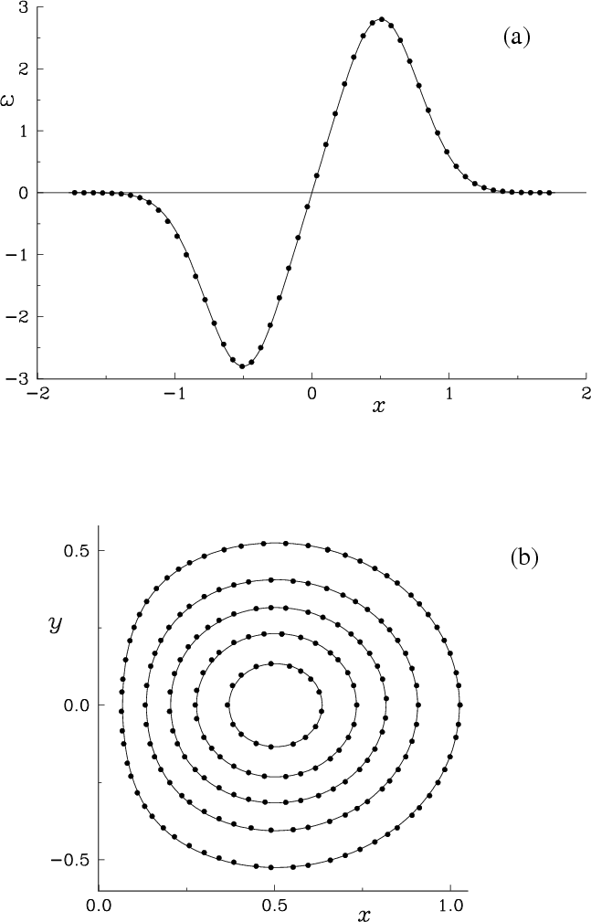 Figure 7.19a shows the vorticity distribution of the vortex pair along the line connecting the vortices. Figure 7.19b shows the isovorticity contours in the right half of the plane containing the vortices. The solid lines are exact solutions and the dots are computed solutions; the solutions are in very good agreement. Our computations show that the circular symmetries in the solution are reproduced very well, even though the symmetries are not explicitly enforced.