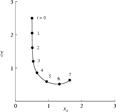 Instead, in our mesh-free procedure we merely placed two set of computational vortices at the locations of the incoming physical vortices. There is no need to structure or order these in our scheme. Except for this simple incorporation of the initial conditions, we ran our scheme for the circular cylinder of section 8.2 completely unchanged. Our wall boundary condition treatment (section 6.3) automatically starts adding vortices at the wall because of the slip velocity induced by the incoming vortices. Our vorticity redistribution method automatically extends the vortices out away from the wall when the vorticity diffuses there. When the different regions of vorticity meet, the vortices of one region automatically begin to use vortices of another region, whenever it is convenient. At all times, the computational vortices remain restricted to only the regions where we need them. This shown in figure 8.42. Such an excellent adaptive resolution of separated vorticity fields would be very difficult to achieve in mesh-based computations.