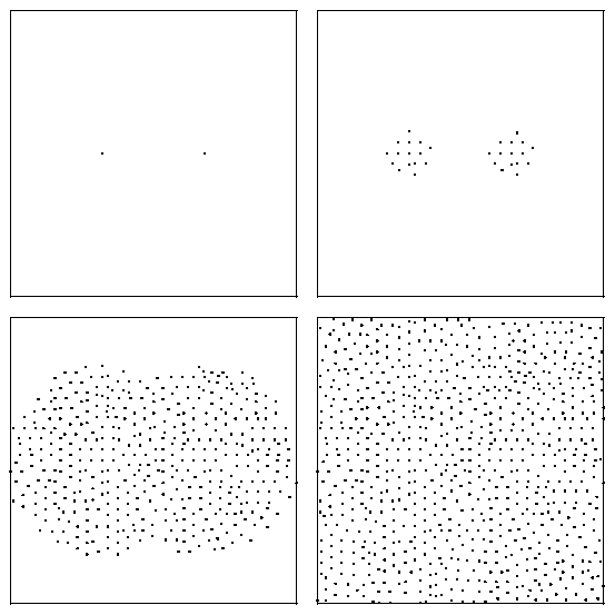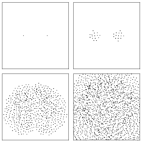 Now for a comparison with the competition! There was already another method that could handle arbitrary point distributions. It is called the `random walk method' and it was devised by Alexandre Joel Chorin of the University of California at Berkeley. The idea of the random walk method is to move the computational points around in a random way, in order to simulate the effects due to the random motion of the molecules. This method is simple to use and it works, but it is not very accurate. If we would have as many computational points as actual molecules there would not be any difficulty, but we will not be able to handle that many points for a very long time, if ever! For the usual amount of points, the new method is more accurate.