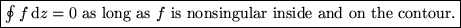 Note that function f=1/z is singular at z=0. As this example shows, the value of a complex contour integral depends critically on singularities inside the contour: