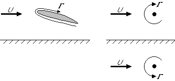 Given a two-dimensional airfoil . We want to approximate the effect of having a ground below the airfoil as compared to the airfoil in free space. To do so, we ``mirror'' the entire flow field into the ground. Then the ground is a streamline because of symmetry. It is really good enough to approximate the airfoil by a vortex while doing this: