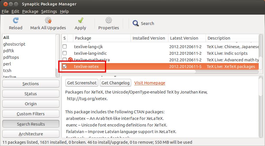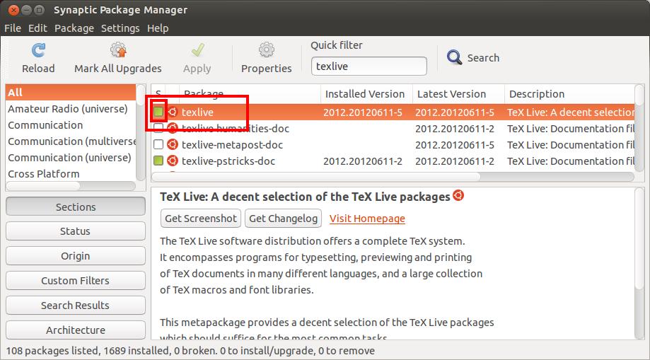 In the opened windows, type in "texlive" for the search string, then