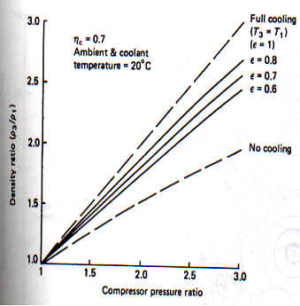 Effect on charge cooling on the density ratio is seen on the graph for a typical isentropic compressor efficiency of 70% and an ambient temperature of 20 deg C. The heat transfer is proportional to pressure drop. This shows that the m
